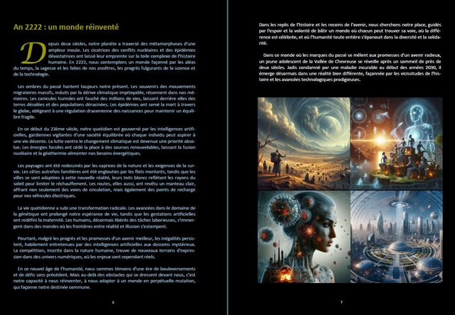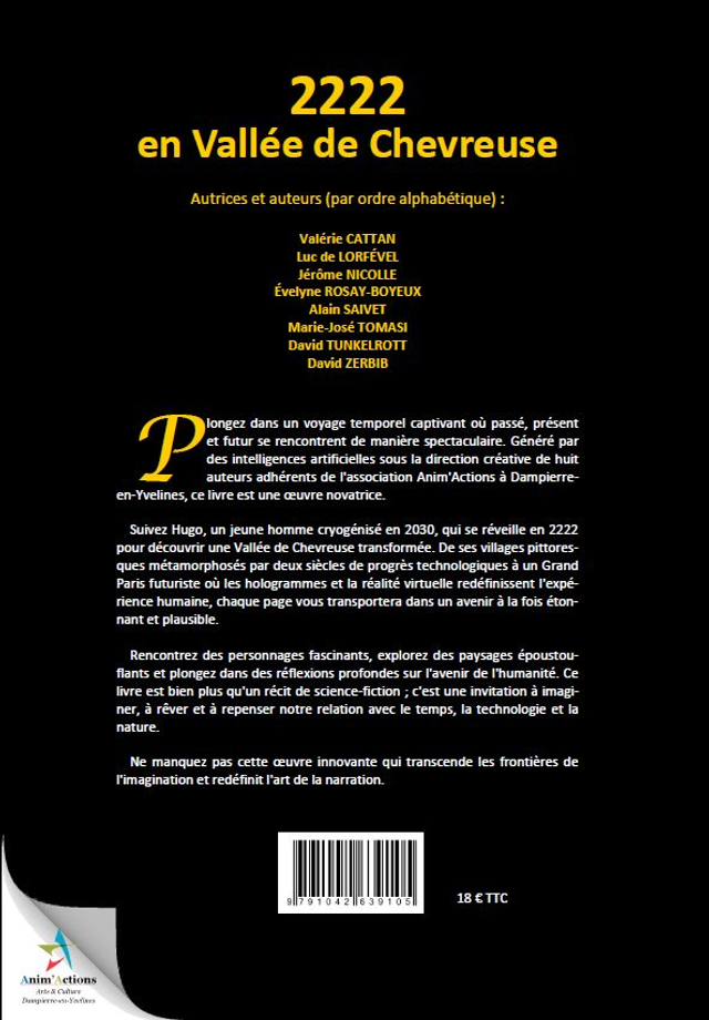 Livre illustré de science fiction écrit par huit auteurs assistés de l'Intelligence Artificielle : 2222 en Vallée de Chevreuse.